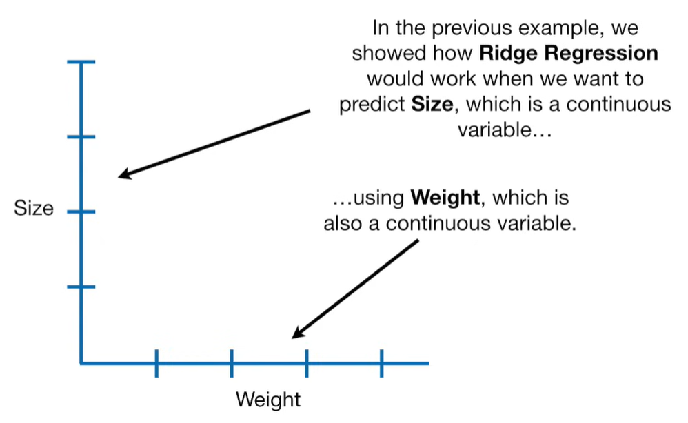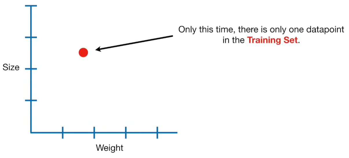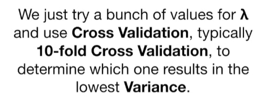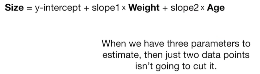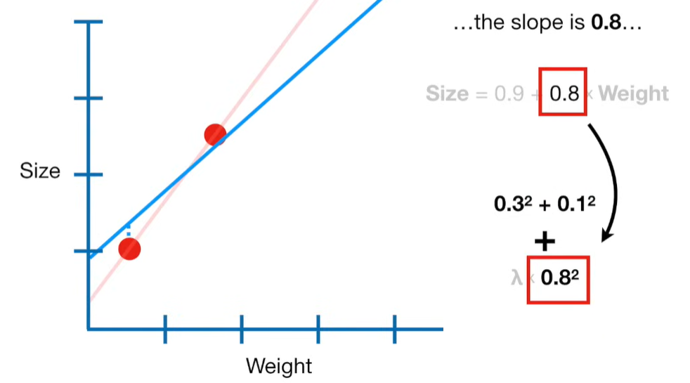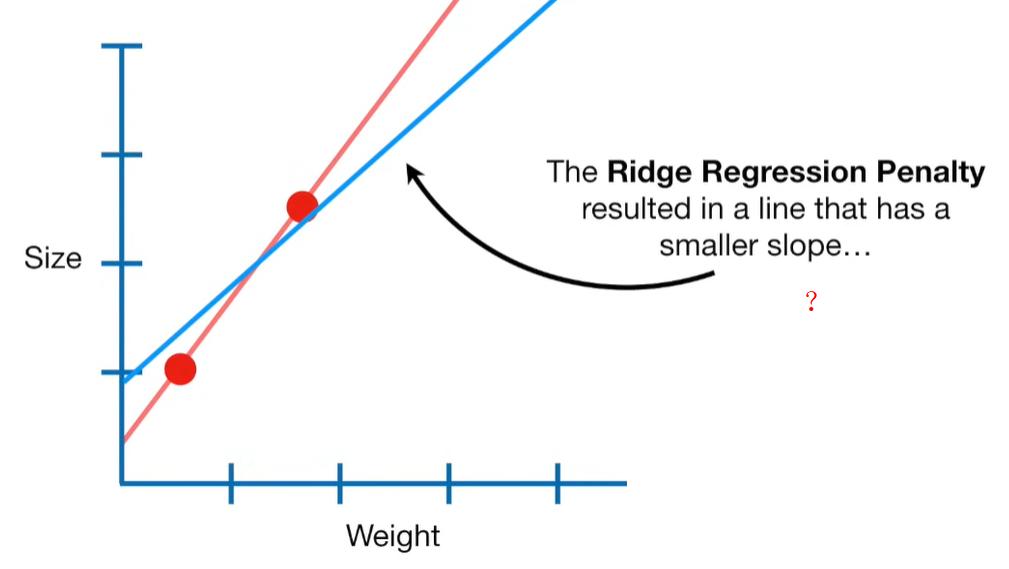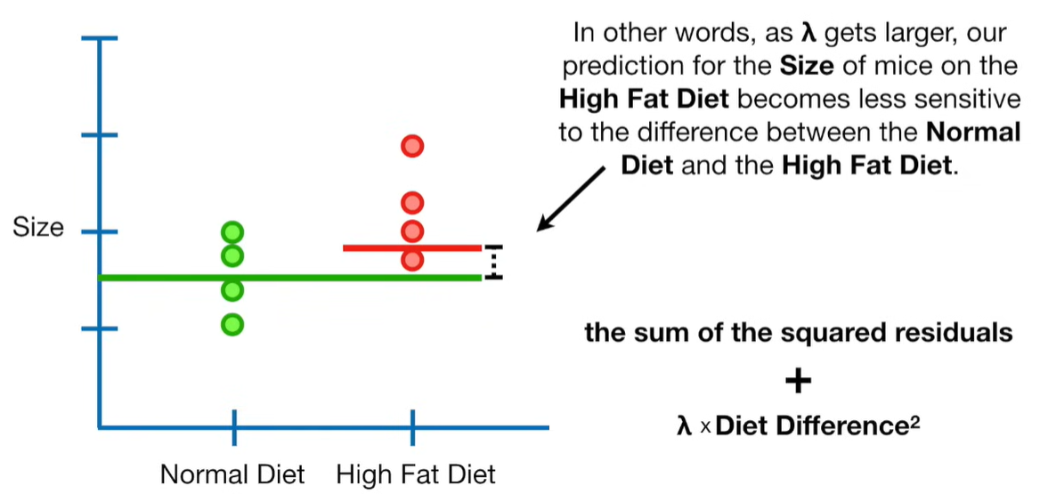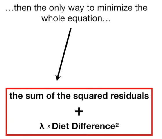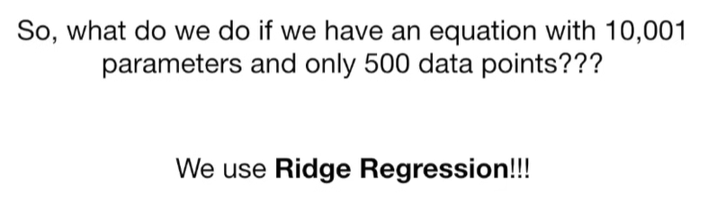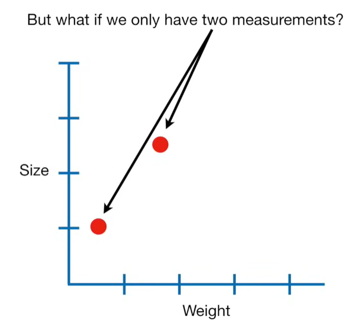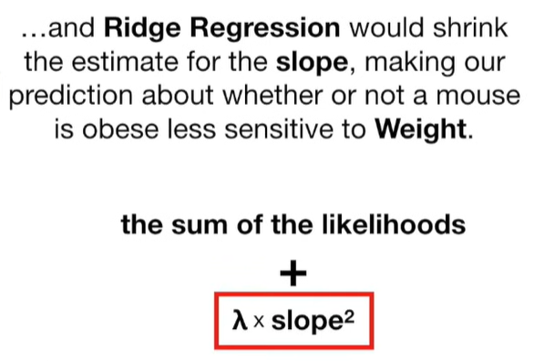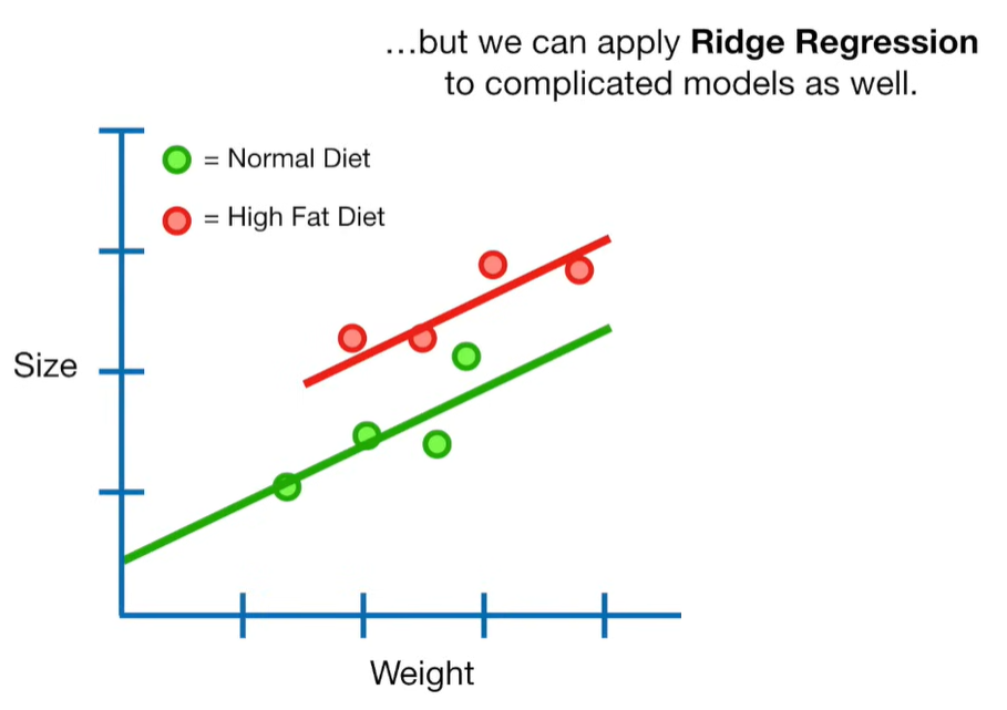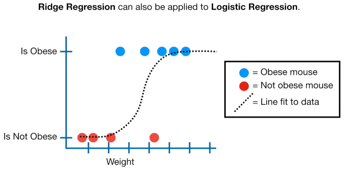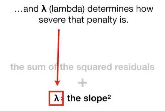 A lot of people ask about 15:34 and how we are supposed to do Cross Validation with only one data point. At this point I was just trying to keep the example simple and if, in practice, you don't have enough data for cross validation then you can't fit a line with ridge regression. However, much more common is that you might have 500 variables but only 400 observations - in this case you have enough data for cross validation and can fit a line with Ridge Regression, but since there are more variables than observations, you can't do ordinary least squares.