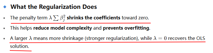The penalty term in Ridge regression shrinks the coefficients toward zero because it adds a cost for large coefficient values. Let’s break this down clearly:
