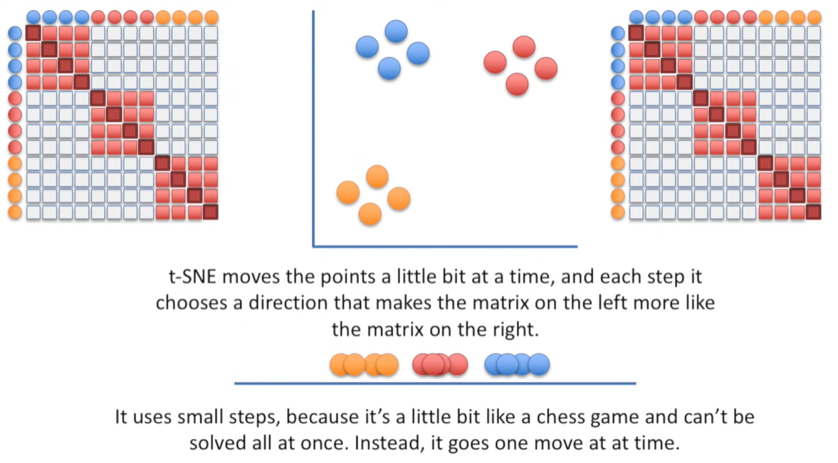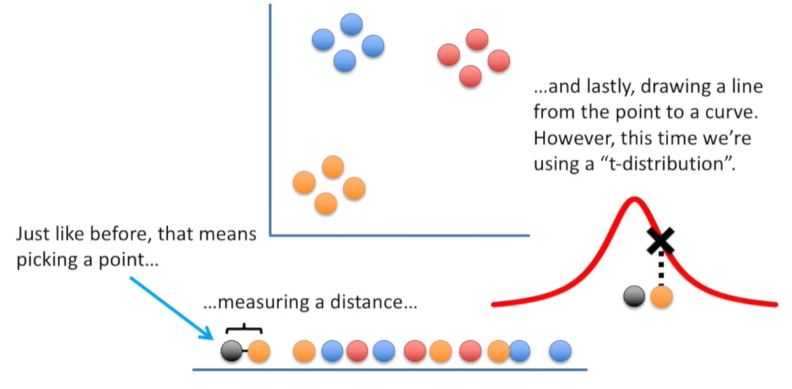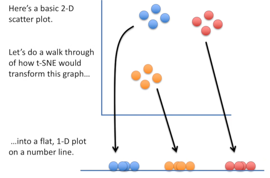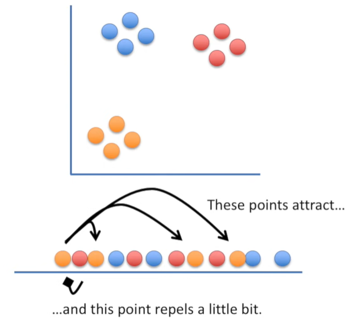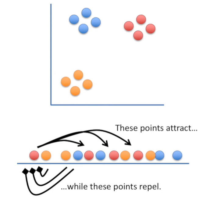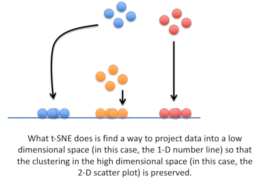 t-SNE takes high-dimensional data (e.g., 100 dimensions) and maps it into a lower-dimensional space (e.g., 2D or 3D) while preserving the local structure of the data — meaning that points that are close together in high-dimensional space remain close in the lower-dimensional map.
