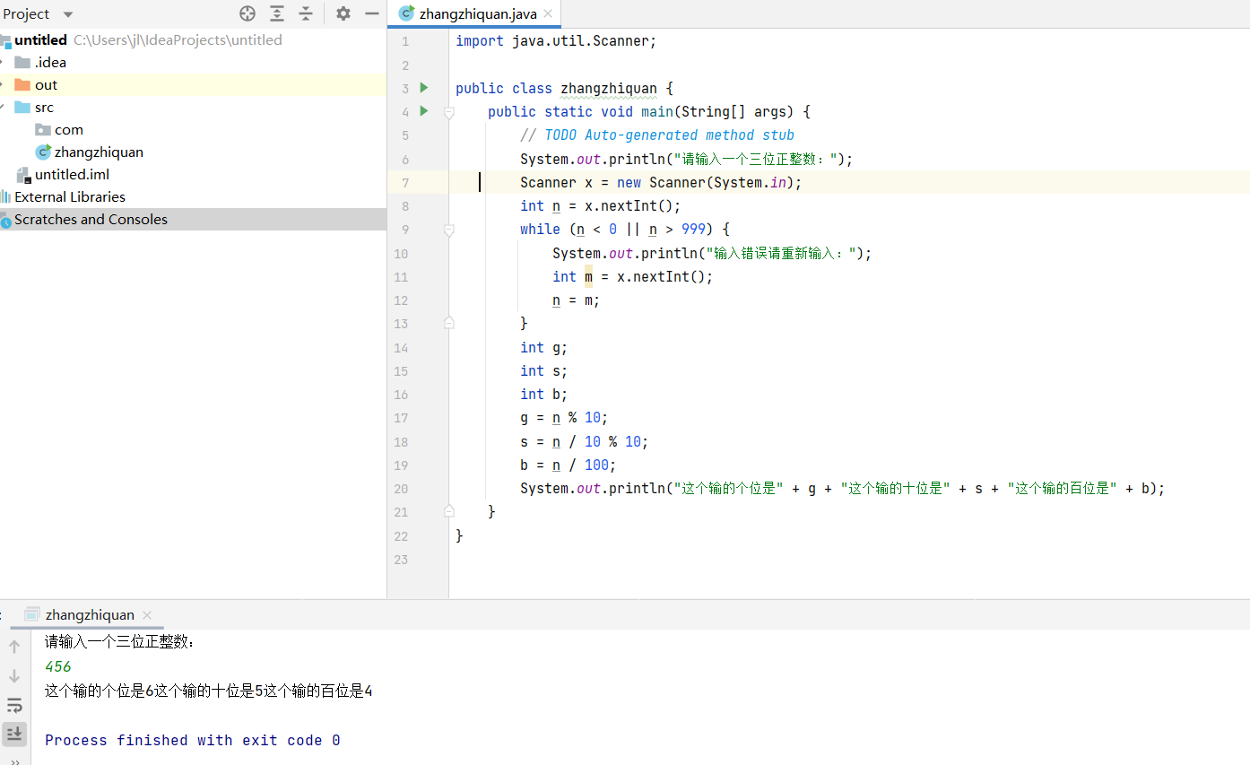 System.out.println("请输入一个三位正整数:");