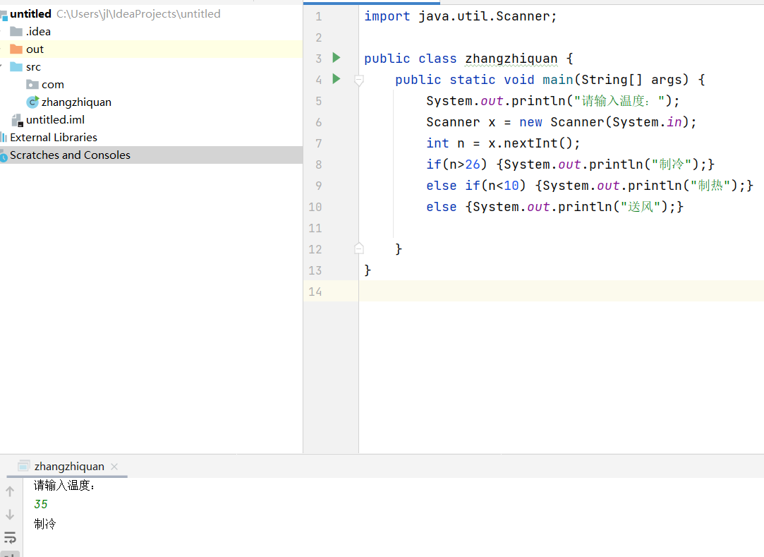 else if(n<10) {System.out.println("制热");}