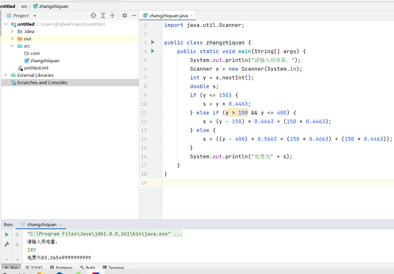 7、居民生活用电按3个梯度收费:月用电量150千瓦时及以下部分,每千瓦时0.4463元,151—400千瓦时部分为0.4663元,401千瓦时以上部分为0.5663元,请编写程序,当输入用户的用电量时,计算出所需付的费用。