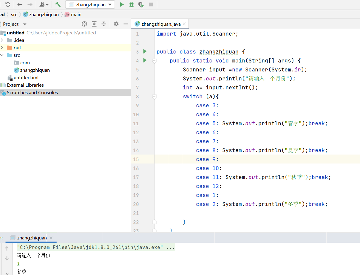 8、要求输入月份,判断该月所处的季节并输出季节(假设:12、1、2月为冬季,依次类推)(使用switch语句编写程序)