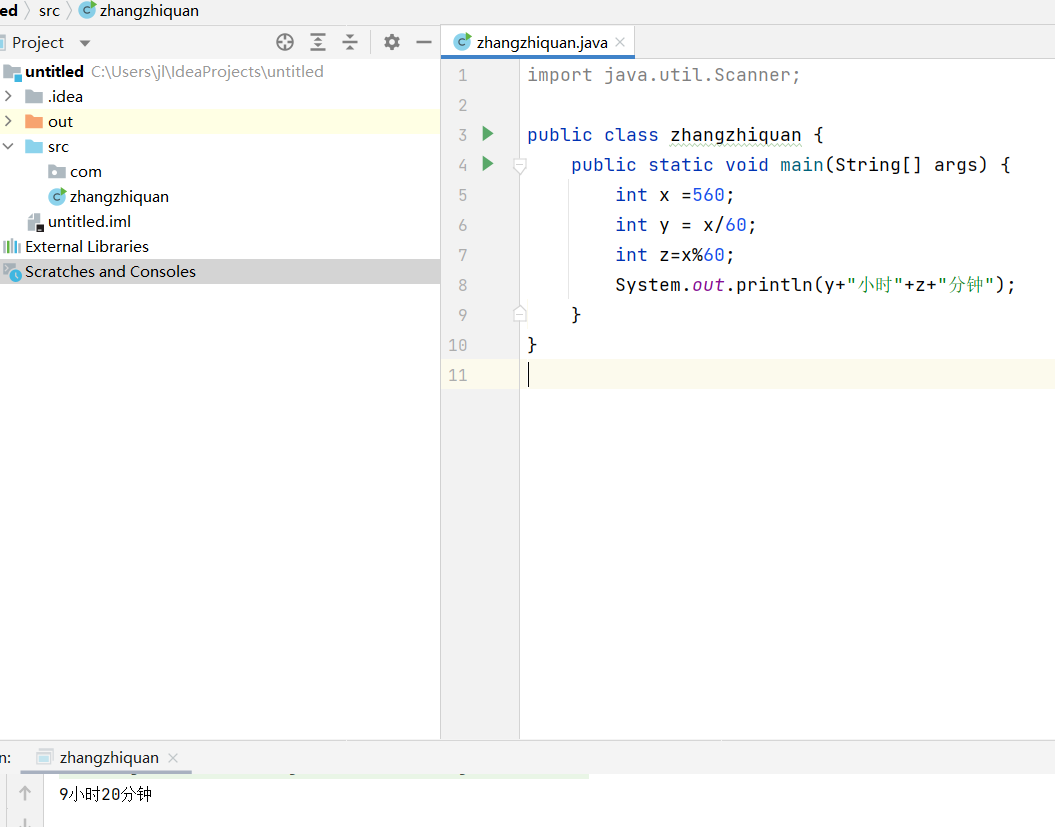9、编写程序,把560分钟换算成用小时和分钟表示,然后输出。