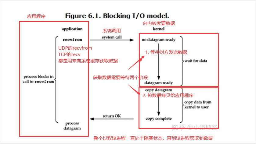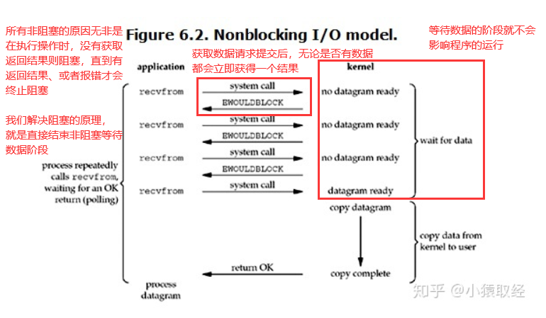 1、输入操作:read、readv、recv、recvfrom、recvmsg共5个函数,如果会阻塞状态,则会经历wait data和copy data两个阶段,如果设置为非阻塞则在wait 不到data时抛出异常