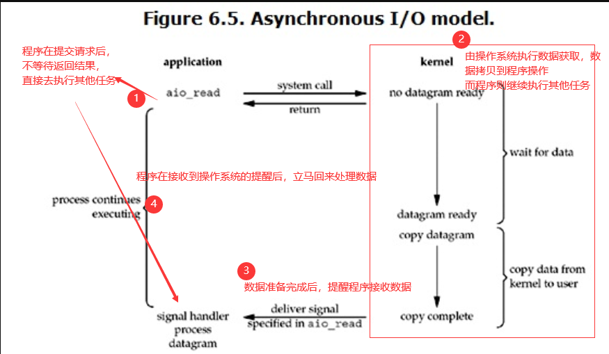 Linux下的asynchronous IO其实用得不多,从内核2.6版本才开始引入。先看一下它的流程: