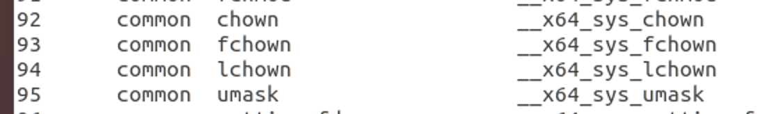 在arch/x86/entry/syscalls/syscall_64.tbl中,找到尾号为94的系统调用为lchown