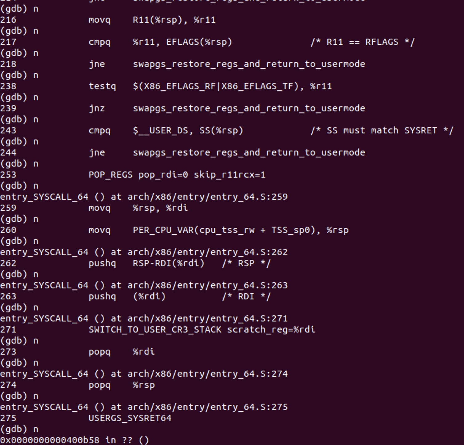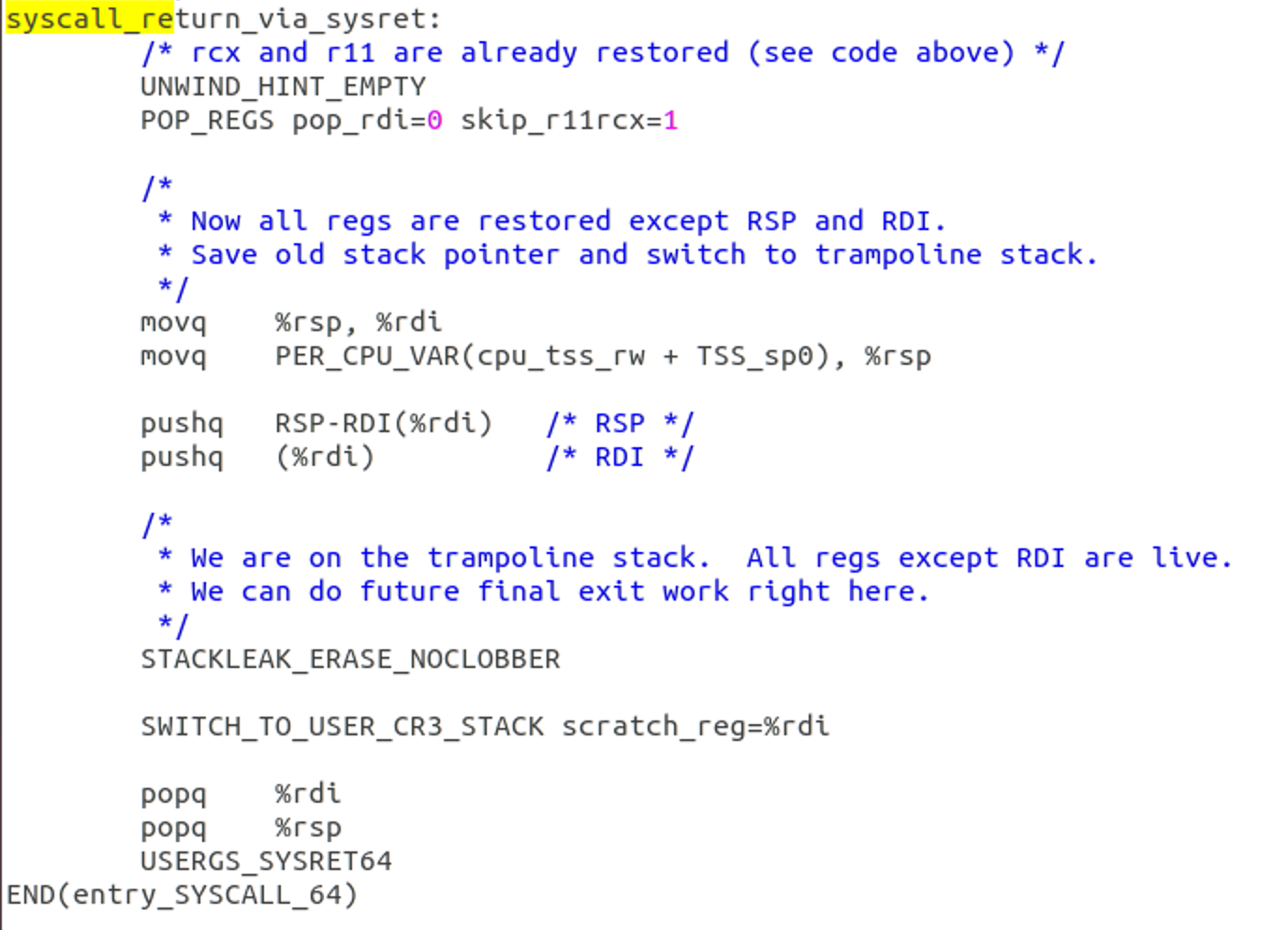 - 重点阅读分析系统调用入口的保存现场、恢复现场和系统调用返回,以及重点关注系统调用过程中内核堆栈状态的变化
