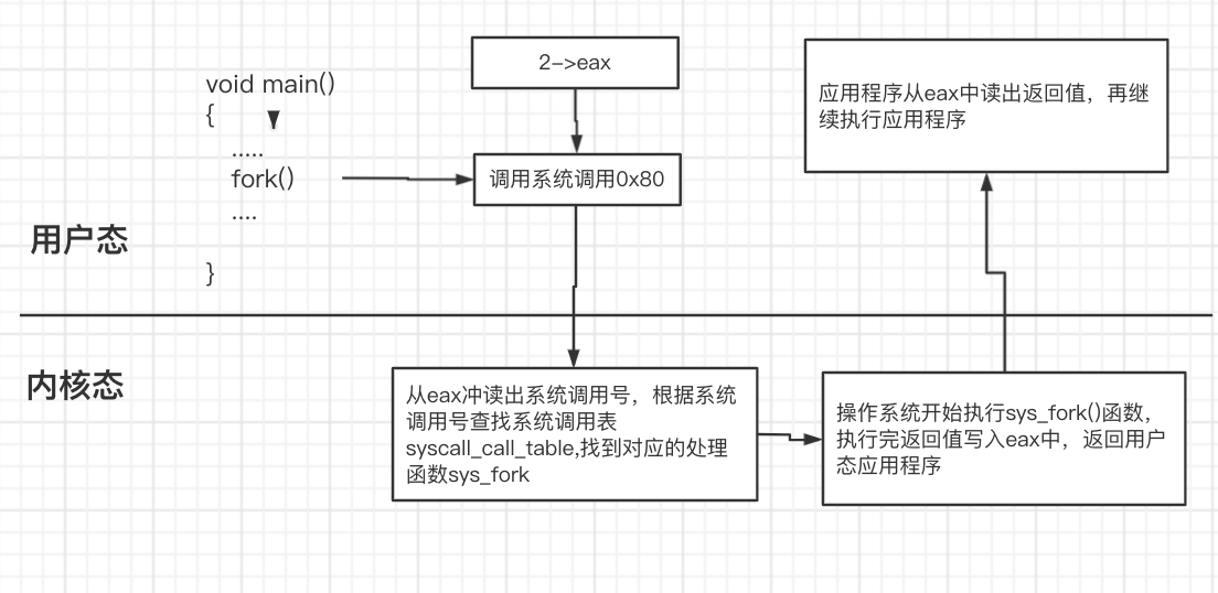 fork系统调用用于创建一个新进程,称为子进程,它与进行fork()调用的进程(父进程)并发运行。创建新的子进程后,两个进程都将执行fork()系统调用之后的下一条指令。子进程使用相同的PC(程序计数器),相同的CPU寄存器,相同的打开文件,这些文件在父进程中使用。fork和一般的系统调用相比,其特殊之处在于,一次系统调用有两次返回:进程通过fork系统调用在内核里面变成了父子两个进程,两个进程均从fork()返回,其中父进程返回子进程id,子进程返回0(成功的情况下)。