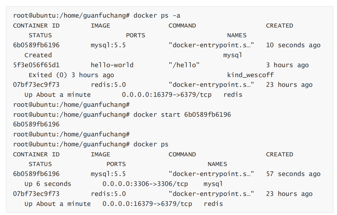 启动容器 dockert start <镜像ID>: