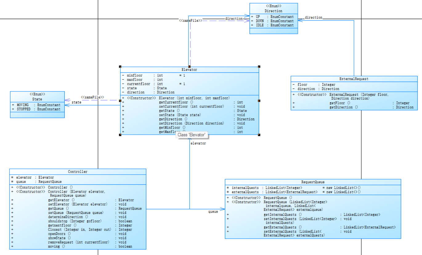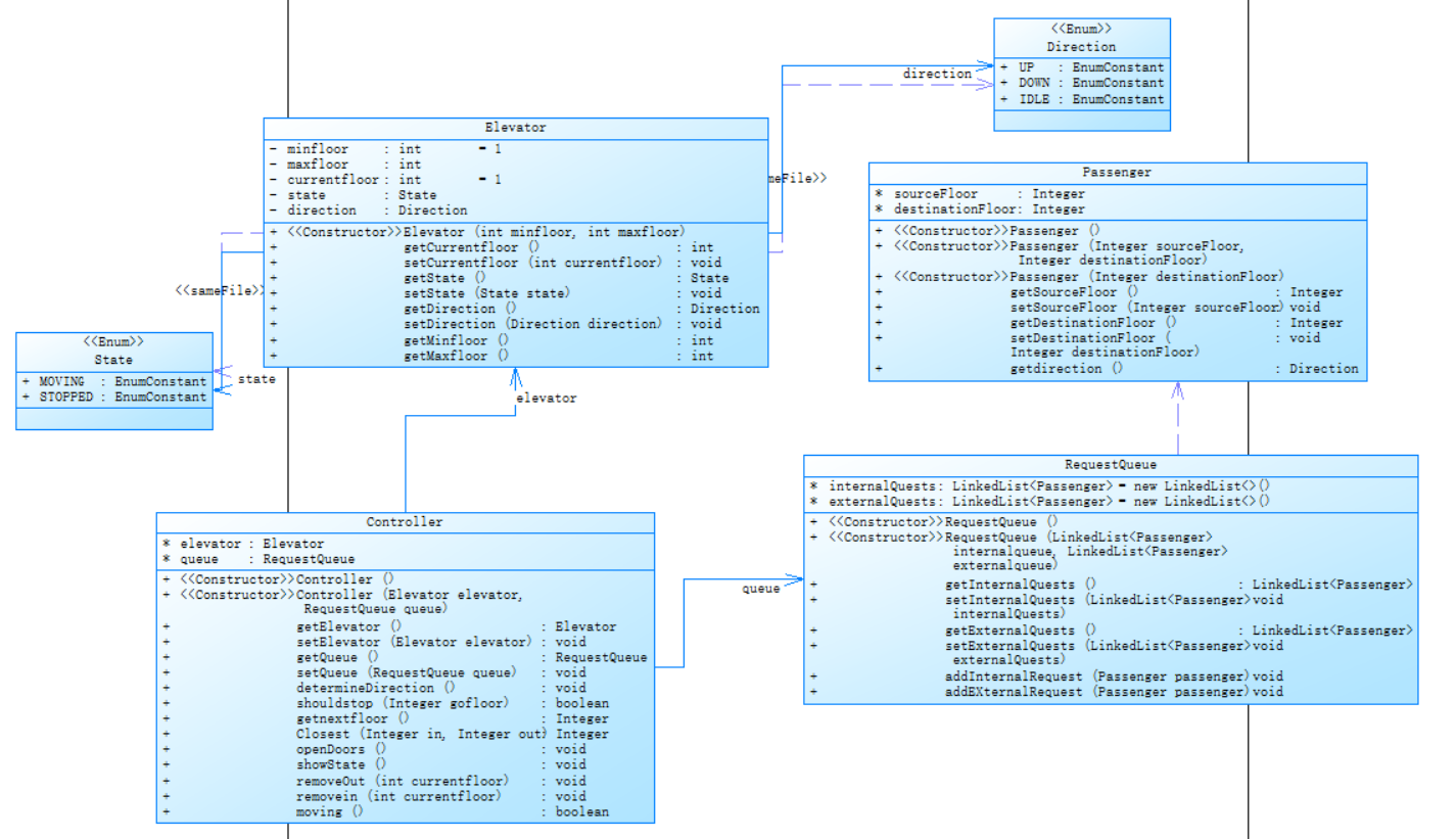 对之前电梯调度程序再次进行迭代性设计,加入乘客类(Passenger),取消乘客请求类,类设计要求遵循单一职责原则(SRP),要求必须包含但不限于设计电梯类、乘客类、队列类以及控制类,具体设计可参考如下类图。