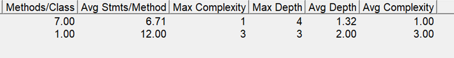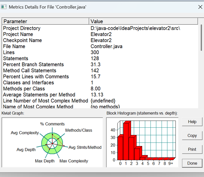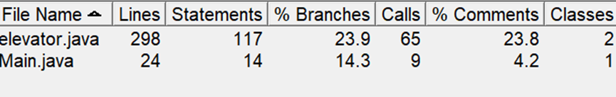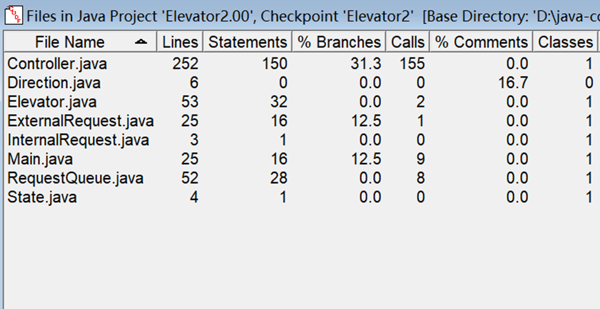 - 类方法数量:“Controller.java” 每个类方法数 15.00 多于 “elevator.java” 的 7.00 ,类的职责划分上 “Controller.java” 更可能存在混乱问题。