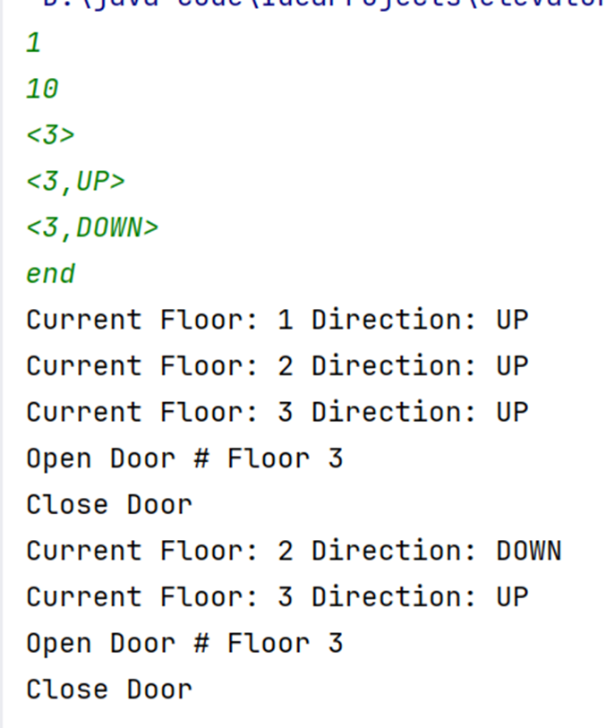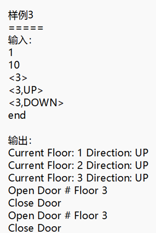 - 电梯外乘客请求格式:<乘客所在楼层数,乘梯方向>,其中,乘梯方向用UP代表上行,用DOWN代表下行(UP、DOWN必须大写)。