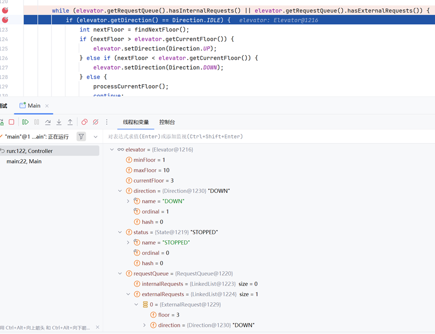 在线程运行至三楼后我的代码只会判断此时内外部的头部请求是否符合并会将其remove但对于外部请求的第二个需求并不会接着判断是否也符合在该层的shouldstop而是检查到没有上方的请求直接转向当运行到2楼时才能检测到此时上方还有一个请求再向上运行执行该外部请求。