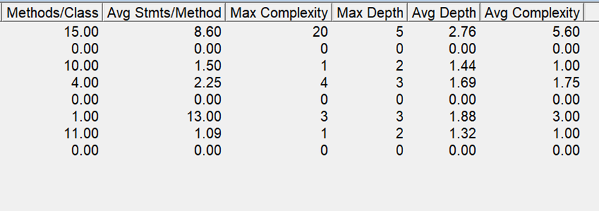 - 方法平均语句数较合理:平均每个方法的语句数(Avg Stmts/Method )为71 ,意味着方法功能相对聚焦,没有出现一个方法包含大量复杂语句的情况,代码的内聚性较好,可读性和可维护性相对较高。