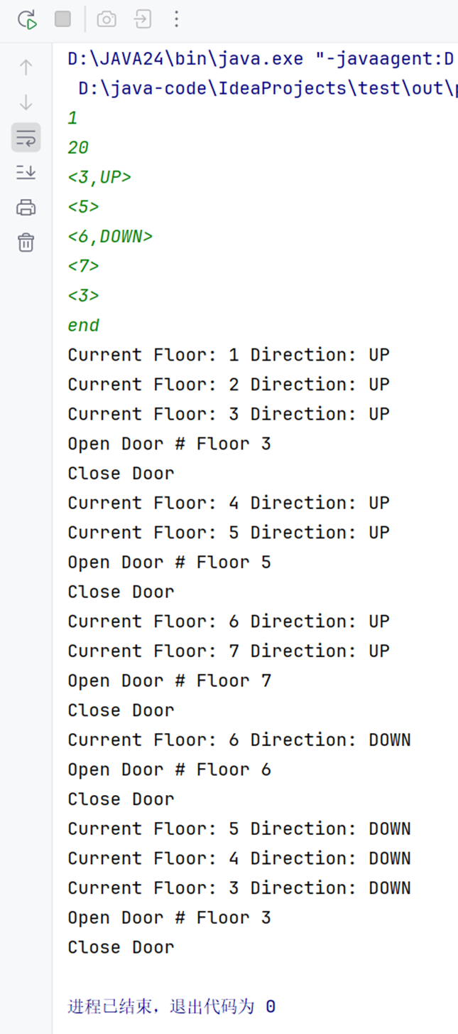 //电梯运行主方法 public void run() { // 初始状态输出 System.out.println("Current Floor: 1 Direction: UP"); // 如果电梯静止,确定初始方向 // printRequests(); if (direction.equals("STILL")) { int nextFloor = findNextFloor(); direction = nextFloor > 1 ? "UP" : "DOWN"; // 当前是1层,首次必为UP } // 主循环:当有任何请求未处理时继续运行 while (!internalRequests.isEmpty() || !externalRequests.isEmpty() ) { // 如果电梯静止,寻找下一个目标楼层 if (direction.equals("STILL")) { int nextFloor = findNextFloor(); if (nextFloor > currentFloor) { direction = "UP"; } else if (nextFloor < currentFloor) { direction = "DOWN"; } else { // 目标楼层就是当前楼层,直接处理 processCurrentFloor(); continue; } } // 根据方向移动电梯 if (direction.equals("UP")) { moveUp(); } else if (direction.equals("DOWN")) { moveDown(); } } // 所有请求处理完毕,重置状态 direction = "STILL"; status = "STOP"; } 这是电梯运行的主方法,确定了电梯的底层运行逻辑,包括确定电梯运行状态,寻找下一楼层和处理楼层。 // 寻找下一个目标楼层 private int findNextFloor() { if (direction.equals("UP")) { // 上行时找上方最近的请求 int nextFloor = maxFloor + 1; // 初始设为超出范围的值 // 检查内部请求 if (!internalRequests.isEmpty() && internalRequests.peek() > currentFloor) { nextFloor = internalRequests.peek(); } // 检查上行外部请求 if (!externalRequests.isEmpty() && externalRequests.peek().floor > currentFloor) { nextFloor = Math.min(nextFloor, externalRequests.peek().floor); } return nextFloor <= maxFloor ? nextFloor : currentFloor; } else if (direction.equals("DOWN")) { // 下行时找下方最近的请求 int nextFloor = minFloor - 1; // 初始设为超出范围的值 // 检查内部请求 if (!internalRequests.isEmpty() && internalRequests.peek() < currentFloor) { nextFloor = internalRequests.peek(); } // 检查下行外部请求 if (!externalRequests.isEmpty() && externalRequests.peek().floor < currentFloor) { nextFloor = Math.max(nextFloor, externalRequests.peek().floor); } return nextFloor >= minFloor ? nextFloor : currentFloor; } else { // 静止时找最近的任何请求 if (!internalRequests.isEmpty()) { return internalRequests.peek(); } if (!externalRequests.isEmpty()) { return externalRequests.peek().floor; } return currentFloor; // 没有请求则保持当前楼层 } }