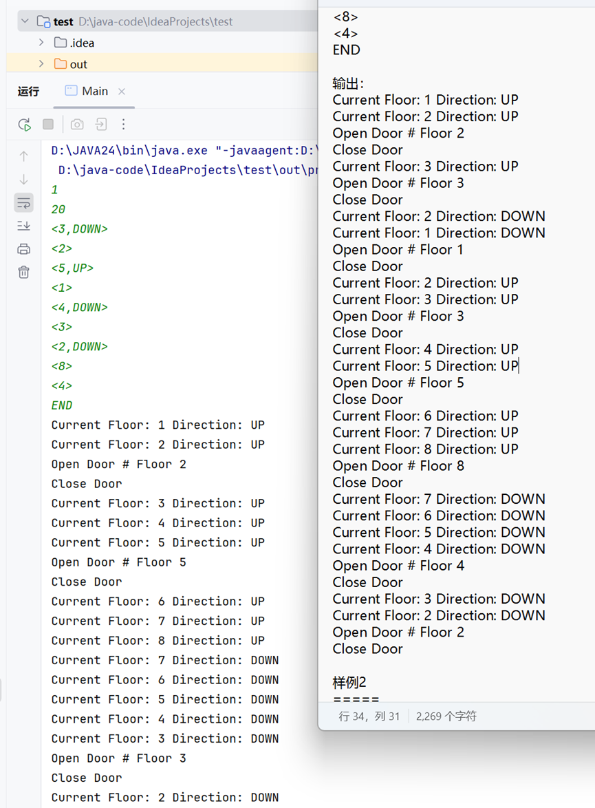 请编写一个Java程序,设计一个电梯类,包含状态管理、请求队列管理以及调度算法,并使用一些测试用例,模拟不同的请求顺序,观察电梯的行为是否符合预期,比如是否优先处理同方向的请求,是否在移动过程中处理顺路的请求等。为了降低编程难度,不考虑同时有多个乘客请求同时发生的情况,即采用串行处理乘客的请求方式(电梯只按照规则响应请求队列中当前的乘客请求,响应结束后再响应下一个请求),具体运行规则详见输入输出样例。