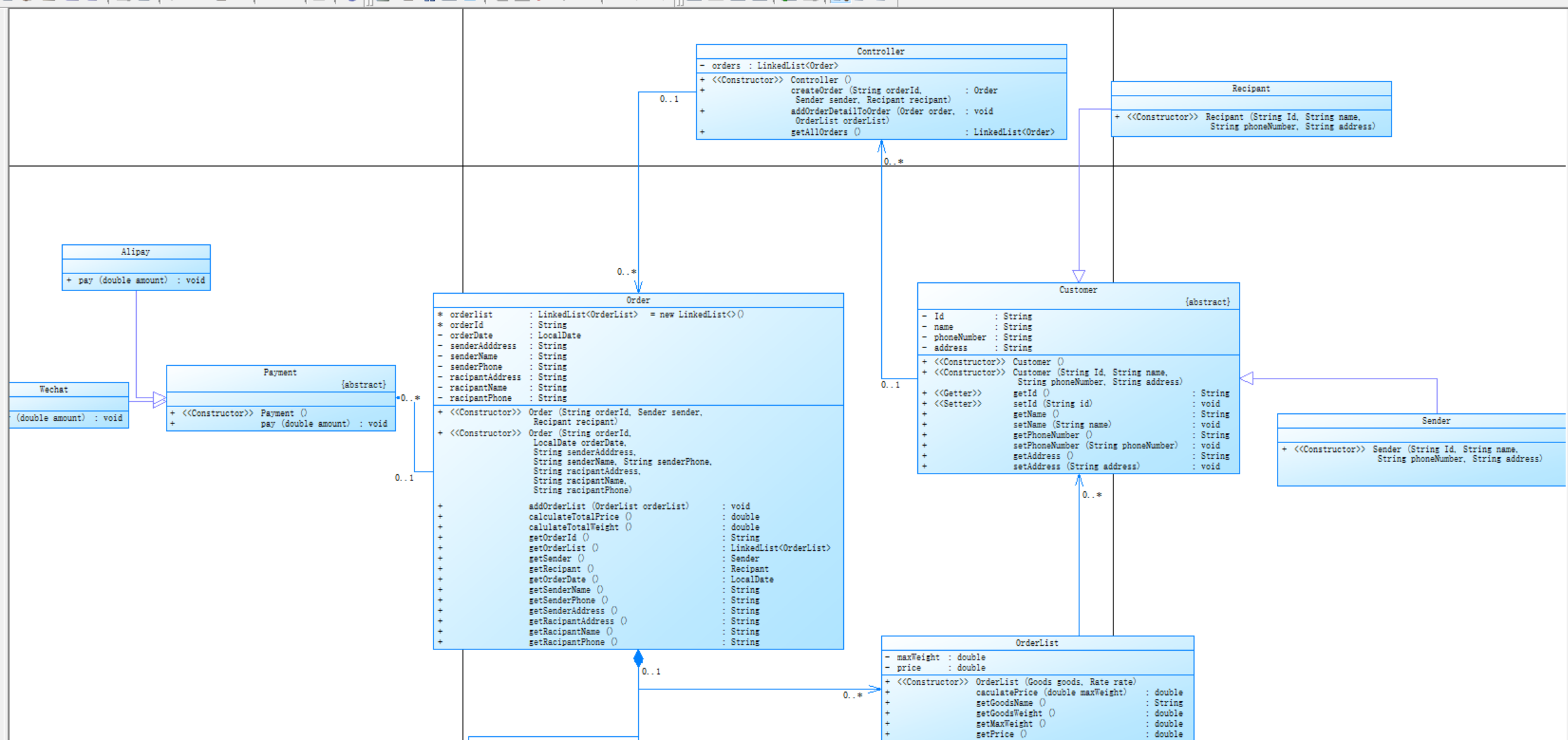 从题目需求可以分析得到此处我们需要制作一个根据货物具体重量来计算收费并生成订单的系统,订单中涉及到顾客,货物,航运公司,费率,支付方式等。故而根据面向对象设计这些应该做成不同的类,同时根据迪米特法则,顾客类与货物类不应直接接触,而应该通过Controller类接触,而对于订单类,如果顾客有增删货物的需求应该直接对订单类进行操作,如若要对订单进行查找则另设一个订单明细类更符合实际生活。此外考虑到后续费率可能根据需求会发生变化故在此处把Rate类设置成一个接口,这样即符合开闭原则只需后续对新需求进行类的扩展而不需要更改,同时又符合依赖倒转法则使OrderList类(高层模块)依赖Rate接口(抽象)而非具体的费率实现类(如RatePrice)。