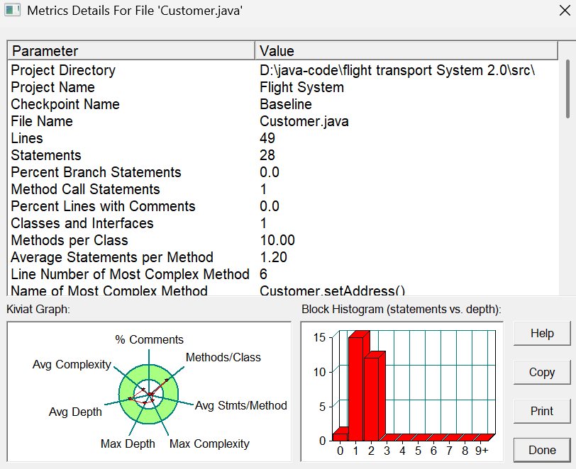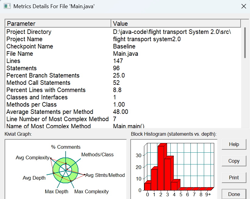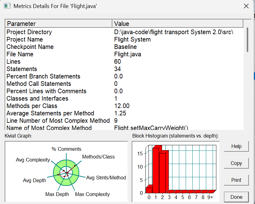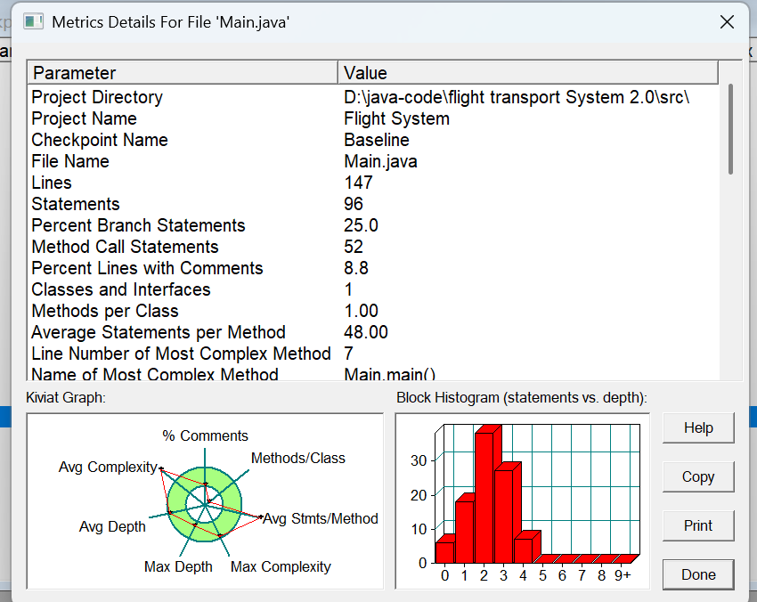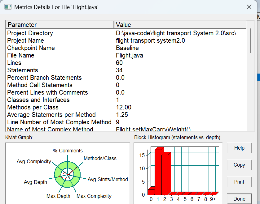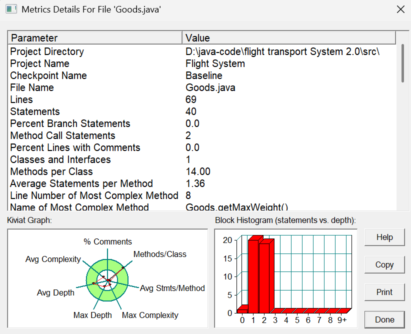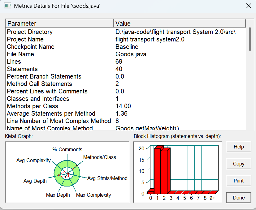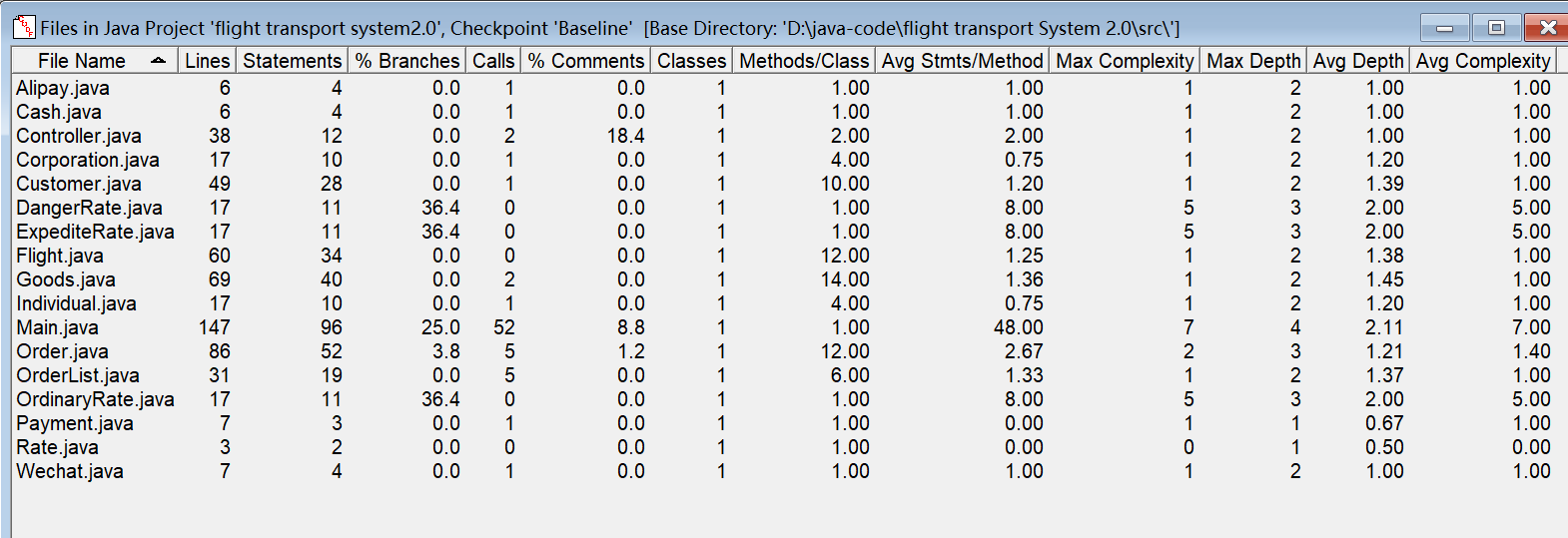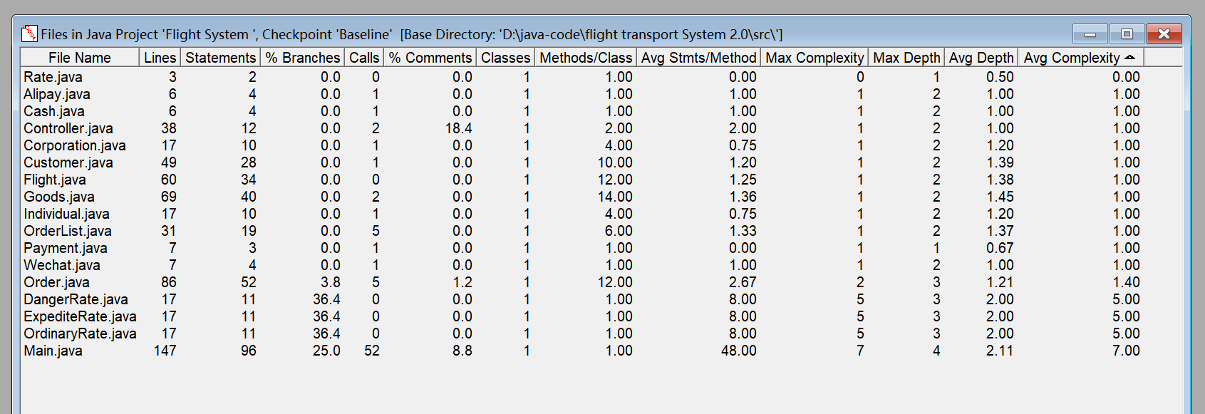 Main类外,Goods、Flight、Order类平均每方法语句数较少,如Goods类为 1.36 ,Flight类为 1.25 ,Order类为 2.67 ,说明多数方法功能单一,易于理解、测试和维护。