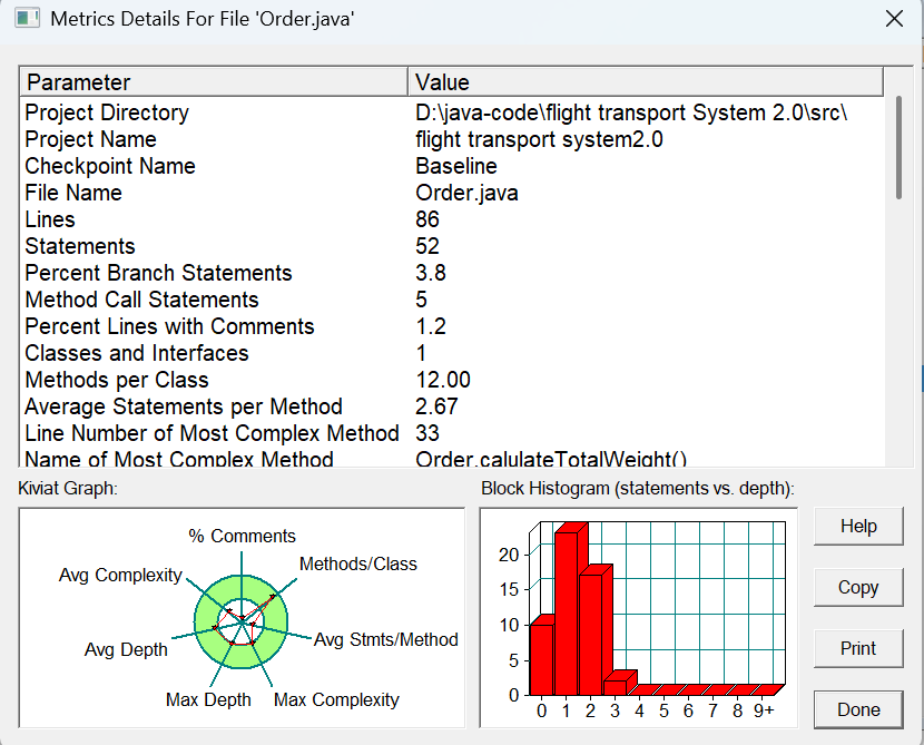 Goods.getMaxWeight()、Flight.setMaxCarryWeight()、Order.calculateTotalWeight()、Main.main()等被标识为最复杂方法 ,这些方法可能包含较多逻辑判断、计算或业务规则,与其他简单方法形成反差,可能成为代码理解、测试和维护的难点,也不利于代码的复用。