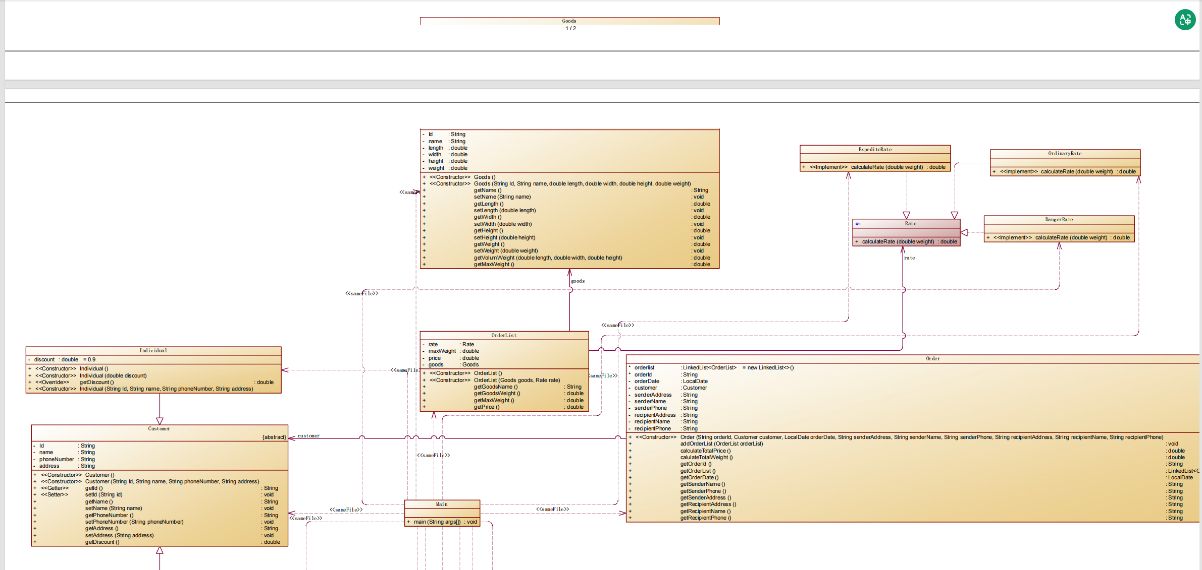 Order类负责订单相关操作,涵盖订单编号、订单日期、货物明细管理以及总重量计算等 ,方法集中处理订单业务,功能内聚。