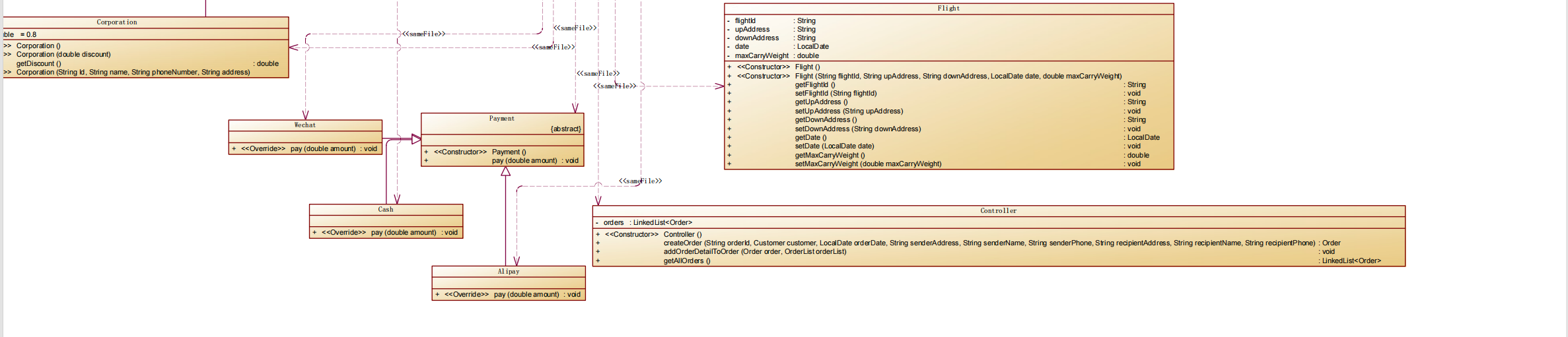 此处由于会按照客户类型进行打折,故需要在顾客类里实验得到折扣的抽象方法,此时如果继续沿用之前将寄件收件人分为两个单独的类则这两个类也需要重写实现折扣的方法,但这样就与题意不符,所以在第二次习题中我删掉了这两个类,换成在主函数中对两个对象进行创建实现题意所需功能。同时新创建了个人客户类和公司客户类来继承客户类实现此处的多态。