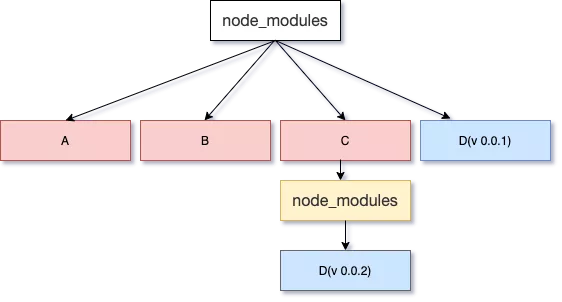 但是这样的层级结构也有较为明显的缺陷,当我的 A,B,C 三个包中有相同的依赖 D 时,执行 npm install 后,D 会被重复下载三次,而随着我们的项目越来越复杂,node_modules 中的依赖树也会越来越复杂,像 D 这样的包也会越来越多,造成了大量的冗余。在 windows 系统中,甚至会因为目录的层级太深导致文件的路径过长,触发文件路径不能超过 280 个字符的错误。