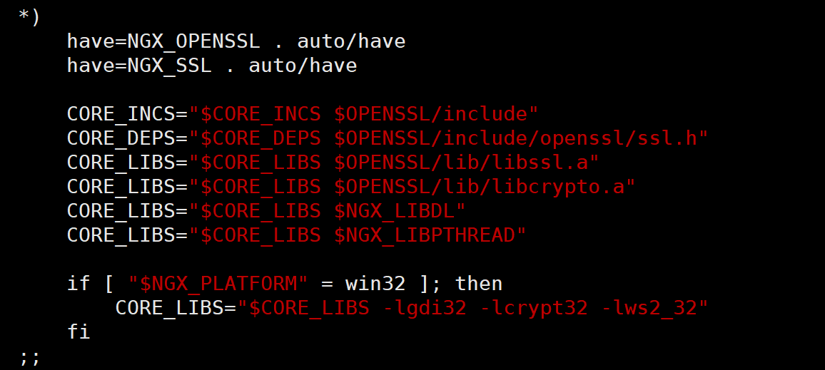 CORE_INCS="$CORE_INCS $OPENSSL/.openssl/include" CORE_DEPS="$CORE_DEPS $OPENSSL/.openssl/include/openssl/ssl.h" CORE_LIBS="$CORE_LIBS $OPENSSL/.openssl/lib/libssl.a" CORE_LIBS="$CORE_LIBS $OPENSSL/.openssl/lib/libcrypto.a"