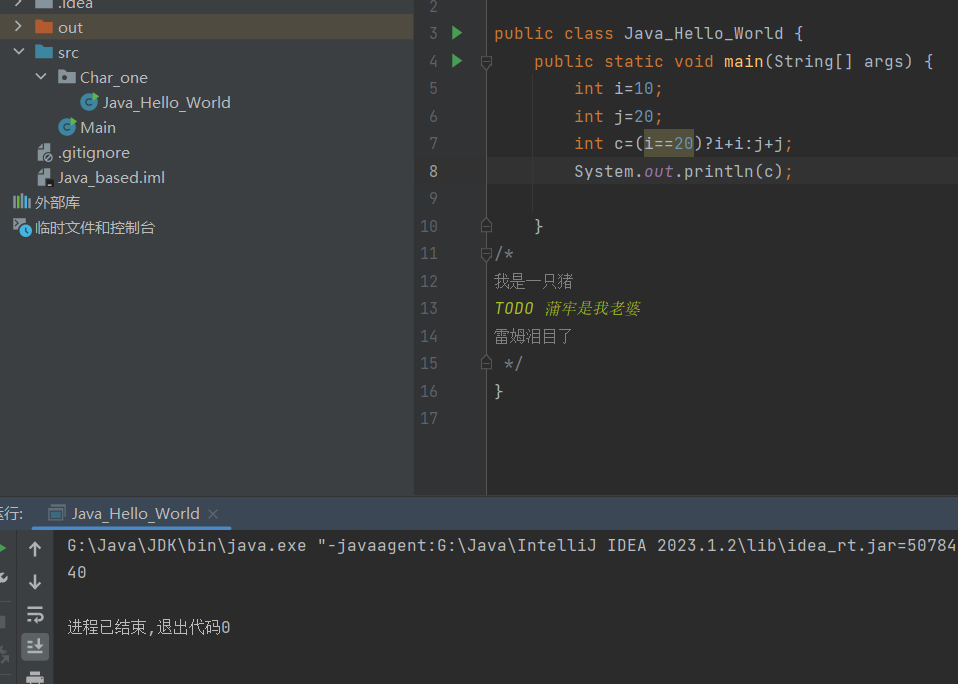 用法格式就是这样子,可以用来两个数的比较,如果前面的括号里的条件成立,就执行后面第一个语句,如果条件不成立,就执行后买你第二个语句。截图可以看到 i !=20,所以执行 j+j,输出的是40.