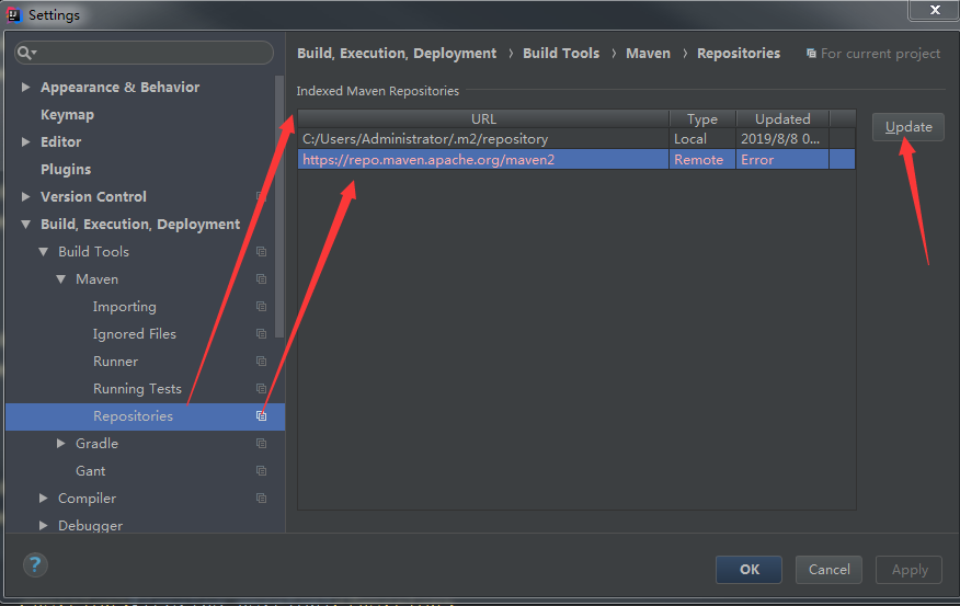 这样一来,File-Settings-Build, Execution, Deployment-Build Tools-Maven-Repository下面的远程地址地址是否"Update"也无所谓了,不过是顶部的是Local本地的仓库地址,有时候如果版本异常,可以尝试选中后,右边"Update"一下
