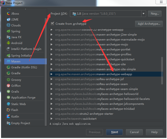 idea-create new project-Maven-上方选择jdk版本,勾选Create from archetype-选中下方maven-archetype-webapp-点击next