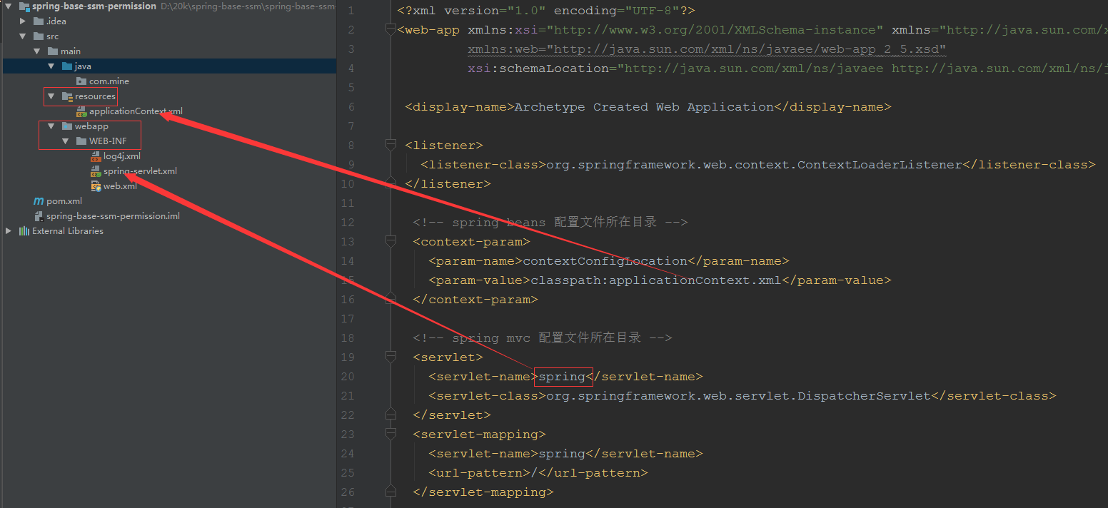 <!-- spring beans 配置文件所在目录 --> <context-param> <param-name>contextConfigLocation</param-name> <param-value>classpath:applicationContext.xml</param-value> </context-param> <!-- spring mvc 配置文件所在目录 --> <servlet> <servlet-name>spring</servlet-name> <servlet-class>org.springframework.web.servlet.DispatcherServlet</servlet-class> </servlet> <servlet-mapping> <servlet-name>spring</servlet-name> <url-pattern>/</url-pattern> </servlet-mapping>