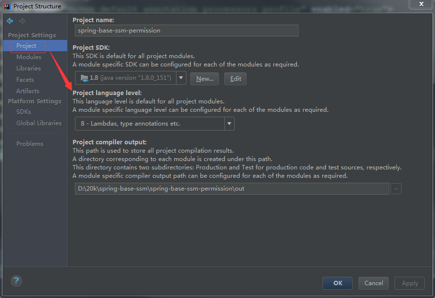 File-Project Structure, 点击Project, 把Project language level设置为 8, 如图