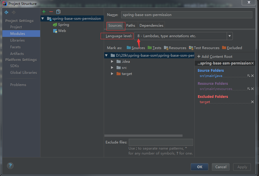 点击Modules,在右边的Sources下设置language level为8, 点击Dependencies,把Module SDK选定为本地的java 1.8,如下两图