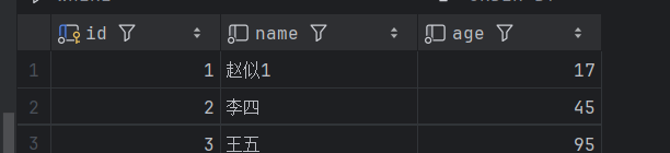 User{id=1, name='赵可名', age=15} User{id=2, name='李四', age=45} User{id=3, name='王五', age=95}