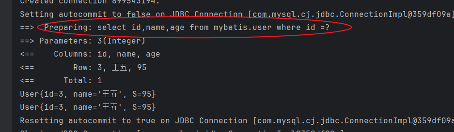 @Test public void getUserList(){ SqlSession sqlSession = MybatisUtils.getSqlSession(); UserMapper mapper = sqlSession.getMapper(UserMapper.class); User user = mapper.selectId(3); System.out.println(user); User user1 = mapper.selectId(3); System.out.println(user1); sqlSession.close(); }