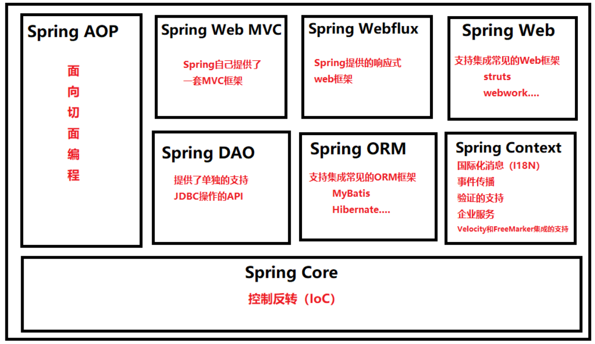 注意:Spring5版本之后是8个模块。在Spring5中新增了WebFlux模块。