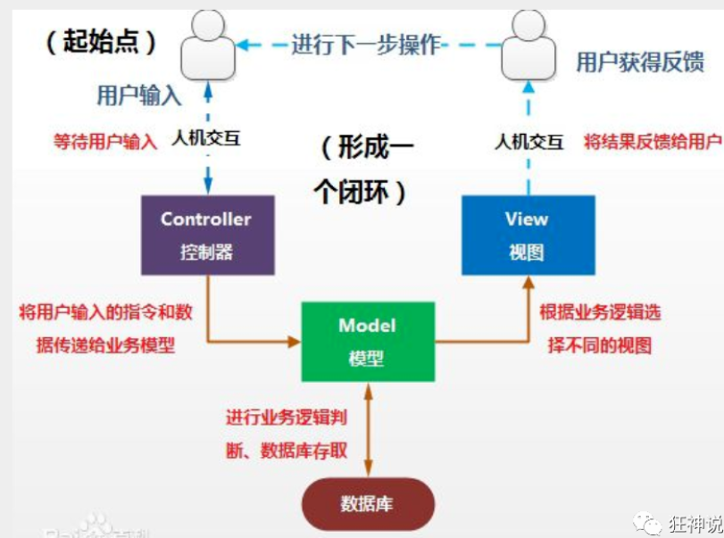 Controller(控制器):接收用户请求,委托给模型进行处理(状态改变),处理完毕后把返回的模型数据返回给视图,由视图负责展示。也就是说控制器做了个调度员的工作。