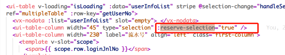 步骤二:在type="selection"的<el-table-column>标签内加上属性reserve-selection,并赋值为true