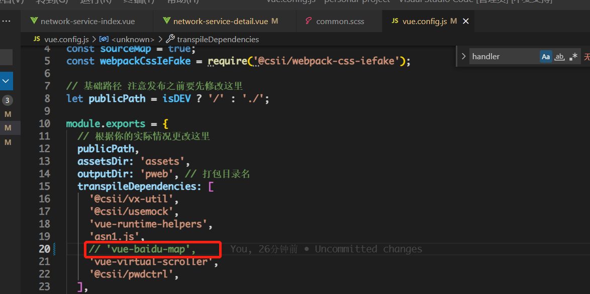 然后他就看了两下告诉我,由于babel打包之后,语法开始降级,ES6语法就会报错,所以把vue.config.js中的内容给注掉了,然后就解决了nice~
