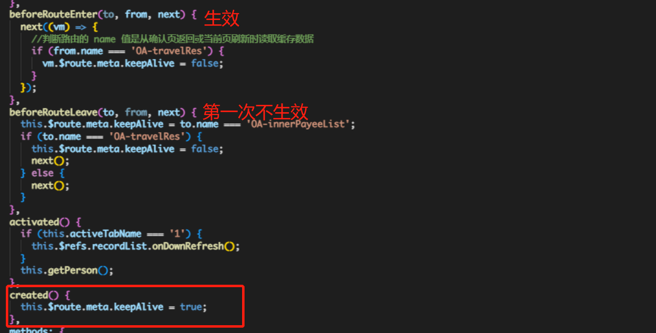 beforeRouterLeave this.$route.meta,keepALive=true ;第一次进入不生效,第二次进入生效