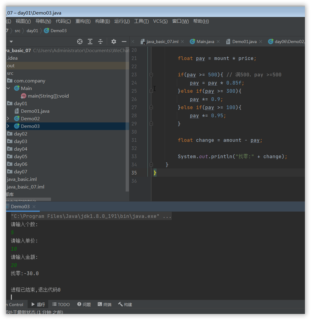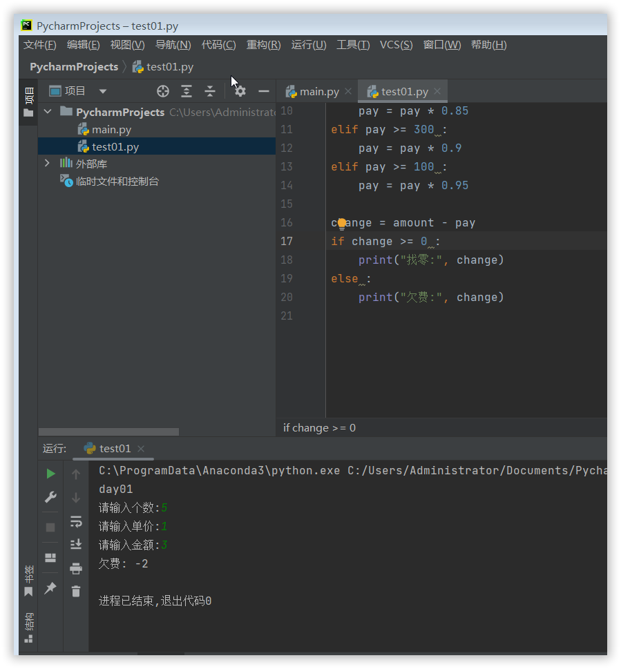 编写收银台小程序,输入个数,单价,金额,输出找零。