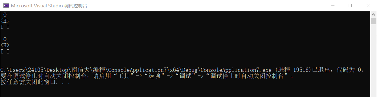 //task1_1 #include <stdio.h> int main() { int i = 1; while (i < 3) { printf(" O\n"); printf("<H>\n"); printf("I I\n"); printf("\n"); i++; } return 0; }