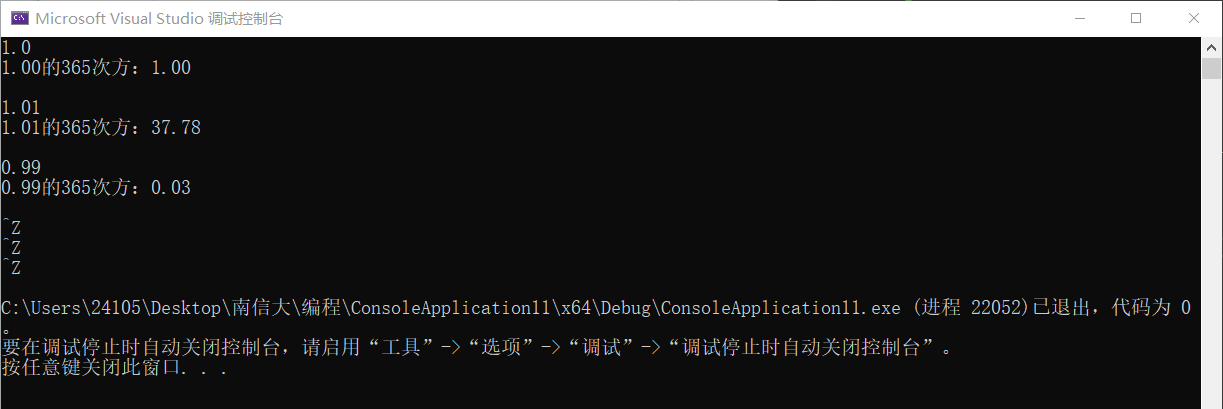 //task2_2 #include <stdio.h> #include <math.h> int main() { double x, ans; while (scanf("%lf", &x) != EOF) { ans = pow(x, 365); printf("%.2f的365次方:%.2f\n", x, ans); printf("\n"); } return 0; }