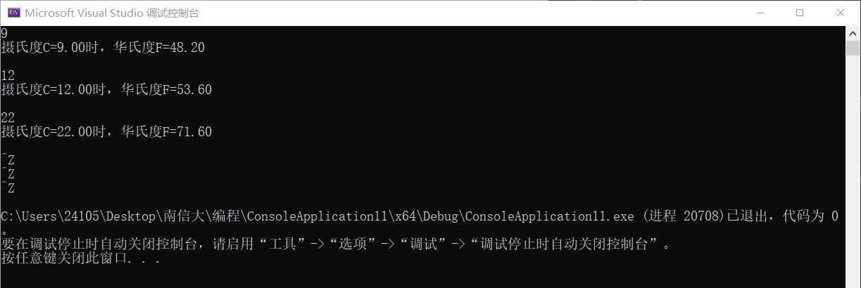 //task2_3 #include <stdio.h> #include <math.h> int main() { double c, f; while (scanf("%lf", &c) != EOF) { f = 9*c / 5 + 32; printf("摄氏度C=%.2f时,华氏度F=%.2f\n", c, f); printf("\n"); } return 0; }