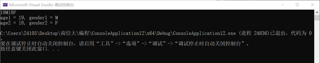 //test4 #include <stdio.h> int main() { int age1, age2; char gender1, gender2; scanf("%d%c%d%c", &age1, &gender1, &age2, &gender2); printf("age1 = %d, gender1 = %c\n", age1, gender1); printf("age2 = %d, gender2 = %c\n", age2, gender2); return 0; }