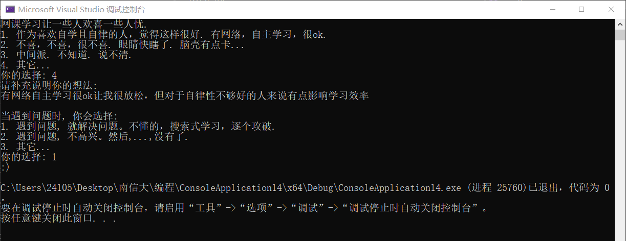//test6 #include <stdio.h> int main() { int answer; char words[5000]; printf("网课学习让一些人欢喜一些人忧.\n"); printf("1. 作为喜欢自学且自律的人,觉得这样很好. 有网络,自主学习,很ok.\n"); printf("2. 不喜,不喜,很不喜. 眼睛快瞎了. 脑壳有点卡...\n"); printf("3. 中间派. 不知道. 说不清.\n"); printf("4. 其它...\n"); printf("你的选择: "); scanf("%d", &answer); if (answer == 4) { printf("请补充说明你的想法: \n"); getchar();//吸收回车 gets_s(words); } printf("\n"); printf("当遇到问题时, 你会选择:\n"); printf("1. 遇到问题, 就解决问题。不懂的,搜索式学习,逐个攻破.\n"); printf("2. 遇到问题, 不高兴。然后,...,没有了.\n"); printf("3. 其它...\n"); printf("你的选择: "); scanf("%d", &answer); if (answer == 1) printf(":)\n"); else if (answer == 2) printf("这样不能解决问题啊...我们选择1好不好:)\n"); else if (answer == 3) { printf("请补充说明你的想法: \n"); getchar();//吸收回车 gets_s(words); } return 0; }