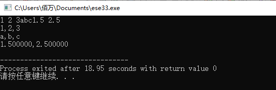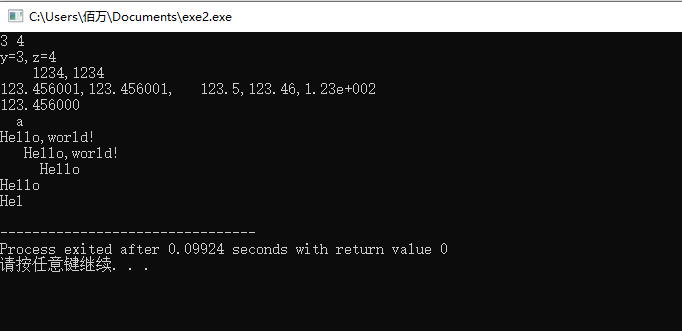 #include<stdio.h> int main(){ int x=1234; float f=123.456; double m=123.456; char ch='a'; char a[]="Hello,world!"; int y=3,z=4; printf("%d %d\n",y,z); printf("y=%d,z=%d\n",y,z); printf("%8d,%2d\n",x,x); printf("%f,%8f,%8.1f,%0.2f,%.2e\n",f,f,f,f,f); printf("%lf\n",m); printf("%3c\n",ch); printf("%s\n%15s\n%10.5s\n%2.5s\n%.3s\n",a,a,a,a,a); return 0; }