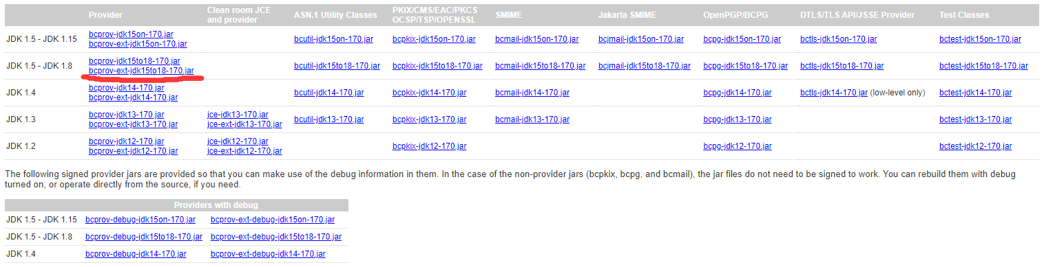 1:在Bouncy castle的官方网站https://www.bouncycastle.org/latest_releases.html下载与你的JDK版本匹配的版本。